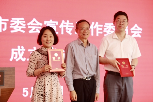 接着,张明华为宣传工作委员会主任曹云和副主任杨淑英颁发聘书。